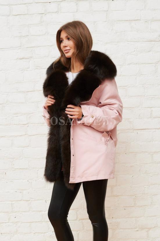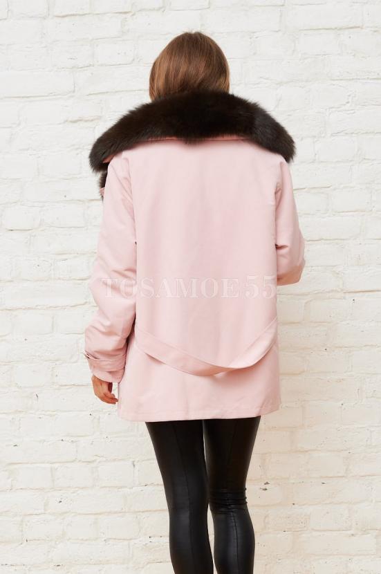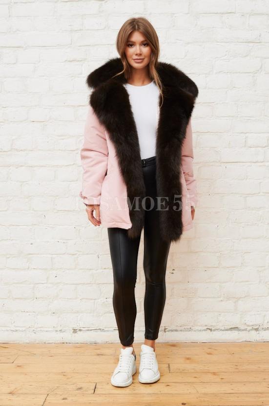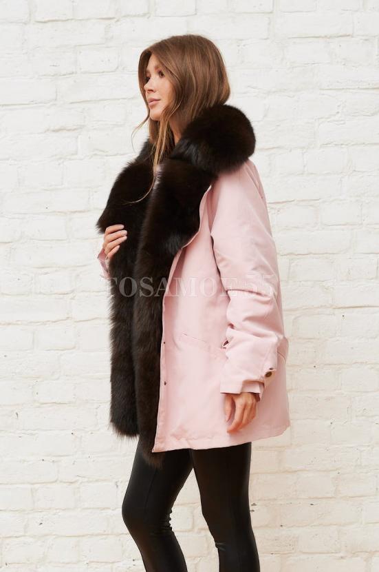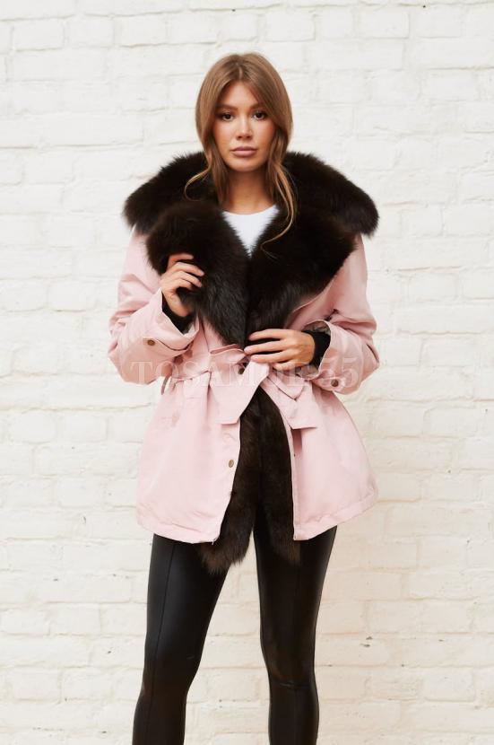Розовая парка с воротником из меха песца